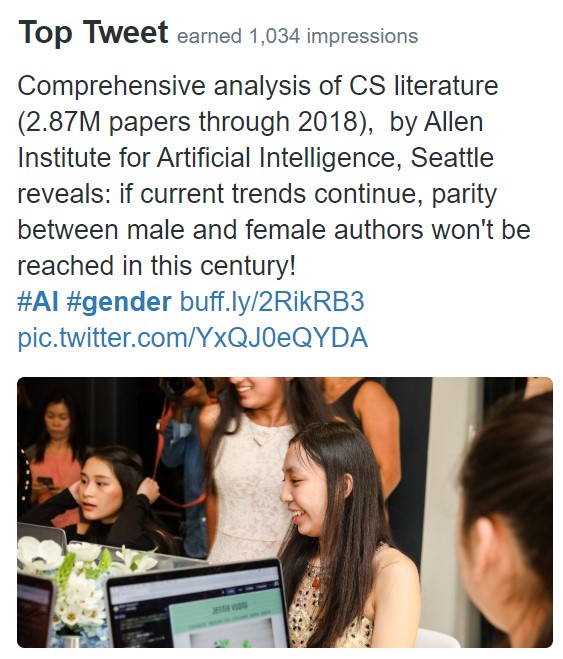On Twitter, the top tweet was the news about the comprehensive analysis of CS literature (2.87M papers through 2018), by Allen Institute for Artificial Intelligence, Seattle which reveals: if current trends continue, parity between male and female authors won’t be reached in this century! Find it here. Our top media tweet was our December newsletter announcement. Thanks for your interest.
